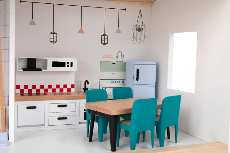 The Tooky Toy dollhouse is an exquisite playset that features a three-storey modern design, constructed entirely from wood. With its sleek lines and contemporary aesthetic, it is the perfect dollhouse for any family with a love for modern architecture.